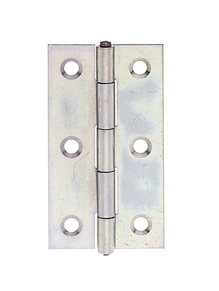 Scharnier, schmal, mit versenkten Schraublöchern, Material: Stahl roh, Oberfläche: sendzimirverzinkt, mit vernietetem Edelstahlstift, Länge: 60 mm, Breite: 34 mm, Ausführung: gerollt, Materialstärke: 1,00 mm, Anzahl Löcher: 6, Loch: Ø4,3 mm