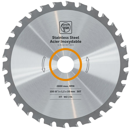 Spezial-Sägeblatt mit härtbaren Schneidezähnen für präzises Trennen von Edelstahl und anderen schockempfindlichen Metallen. Dank hochwertiger Wendeschneidplatten bzw. schneidender Kanten erzielen Sie saubere, gerade Schnitte und gute Standzeit auch bei anspruchsvollen Legierungen. Durchmesser Ø 150 mm, geeignet für FEIN Handkreissägen und kompatible Maschinen mit passender Spindel- und Lochkreis-Anbindung.