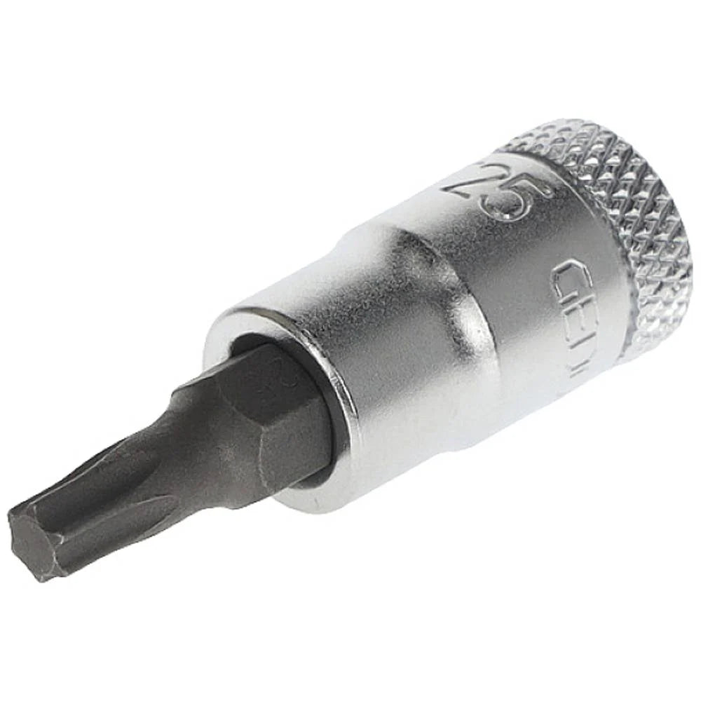 Der GEDORE Schraubendrehereinsatz 1/4" TORX T25 vereint Präzision, Vielseitigkeit und Zuverlässigkeit für anspruchsvolle Schraubaufgaben. Gefertigt aus hochwertigem Werkzeugstahl sorgt der korrosionsbeständige 1/4"-Antrieb für eine sichere Passform und stabile Kraftübertragung zu Drehwerkzeugen wie Drehmomentwerkzeugen, Ratschenschraubern und Akkuschraubern. Der TORX-T25-Antrieb ermöglicht eine hohe Drehmomentübertragung bei sicherem Sitz der Schraubverbindung, während die präzise Fertigung eine reibungslose Aktivierung und eine exakte Führung der Schraubenkanten gewährleistet.