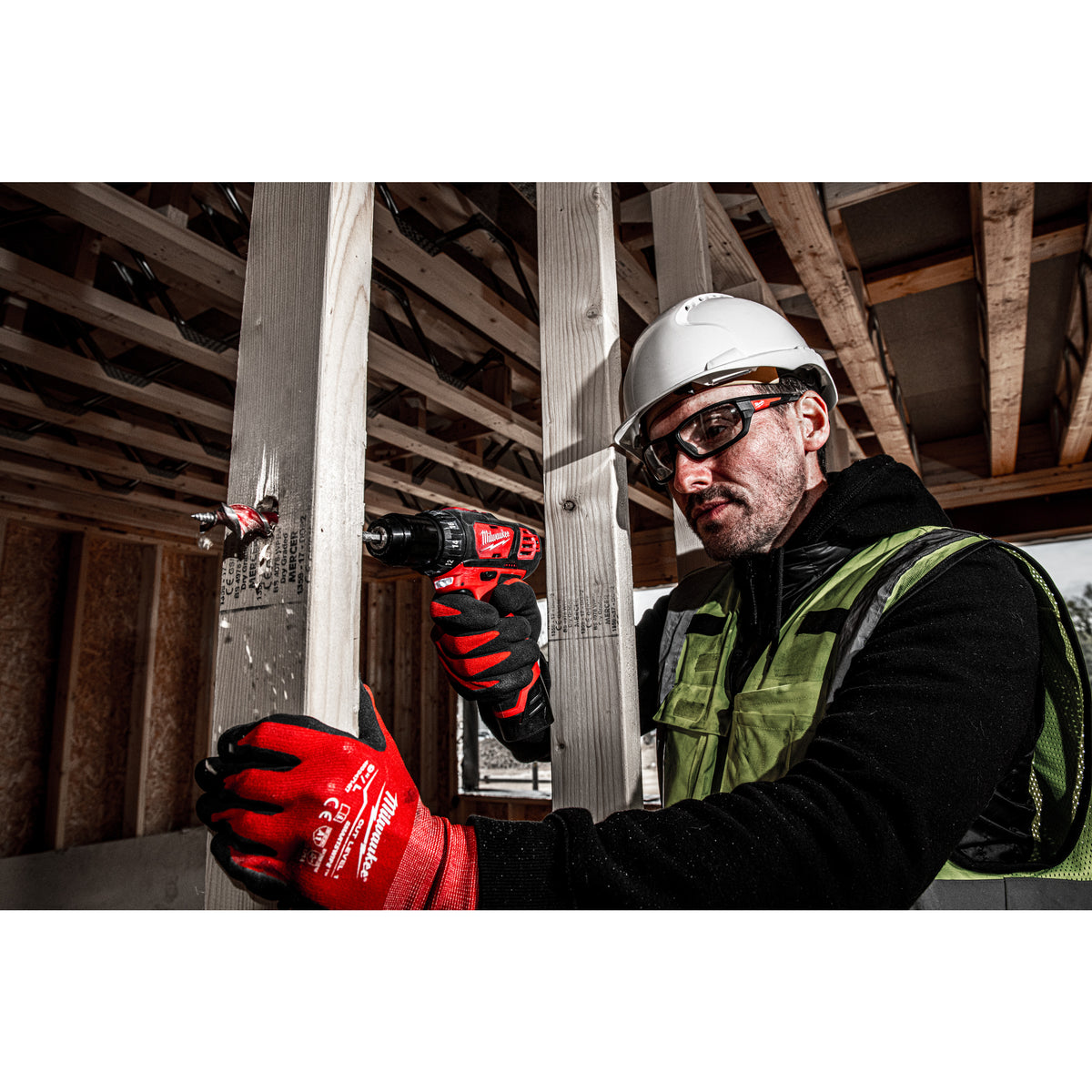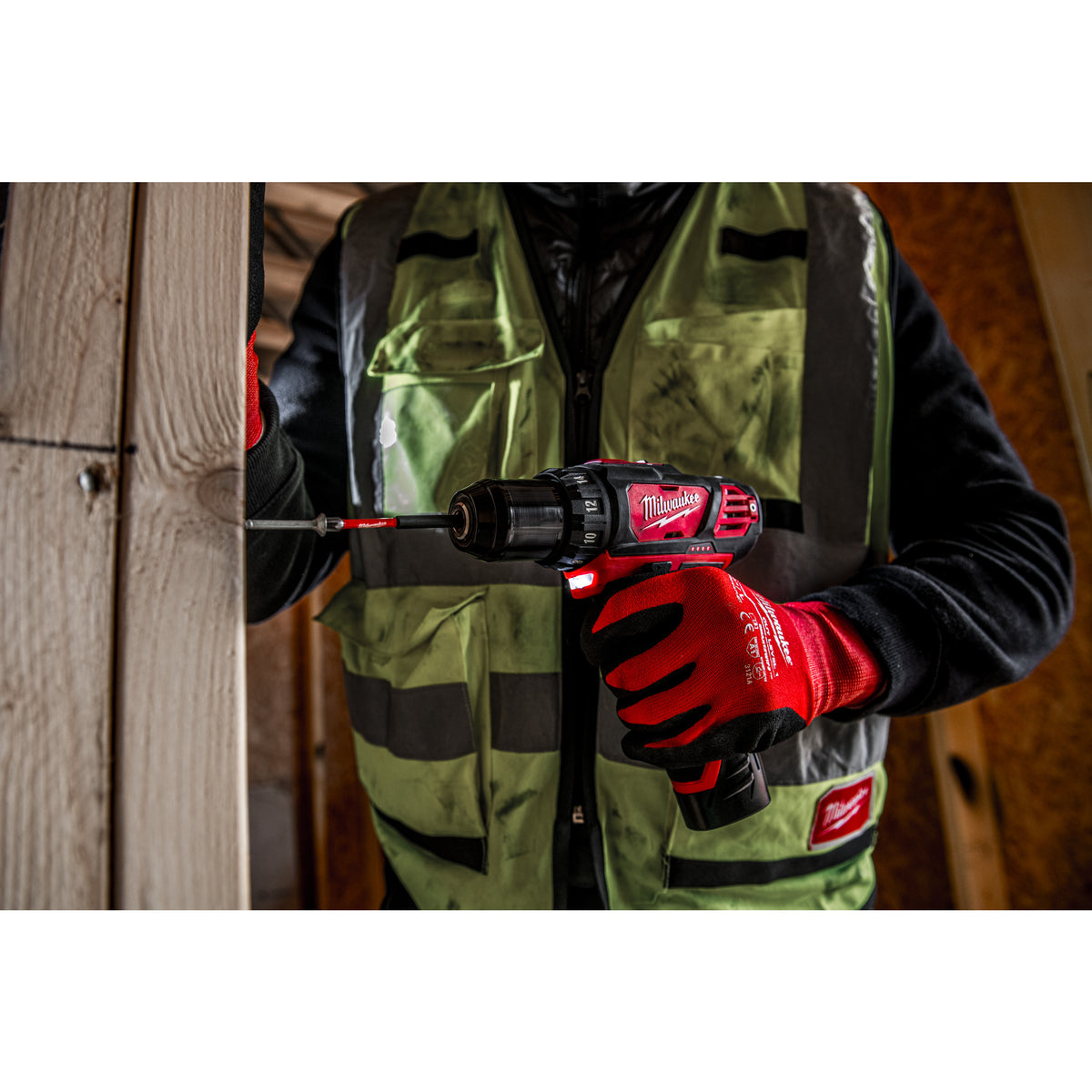 M12BDD Akku-Bohrschrauber. Handlicher Akku-Kompakt-Bohrschrauber: nur 189 mm Länge. REDLINK™-Elektronik – Überlastschutz in Maschine und Akku sorgt für lange Lebensdauer . 10-mm-Metall-Schnellspannbohrfutter mit Spindel-Lock. Optimierter Handgriff mit Softgrip-Auflage für beste Ergonomie und Griffigkeit. Einzelzellenüberwachung für optimierte Standzeit und lange Lebensdauer des Akkus. LED-Beleuchtung des Arbeitsbereichs. Der REDLITHIUM™-Akku bietet eine perfekt abgestimmte Konstruktion, eine fortschrittliche Elektronik und eine verlustfreie Leistungsabgabe für längere Standzeit und längere Lebensdauer als bei Vorgängermodellen. 100 % systemkompatibel mit dem MILWAUKEE®-M12™-Produktprogramm. Schutzbrille klar. Geringes Gewicht für hohen Komfort bei längerem Tragen. Verstellbarer und abnehmbarer Nasenbügel zur optimalen Anpassung an alle Gesichtsformen. Komfortable und flexible Brillenbügel für zusätzlichen Tragekomfort. Europäisches Zertifikat: EN166 und EN 170 / 172