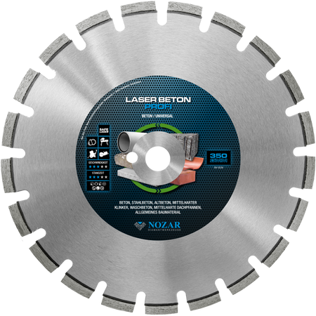 Die Nozar Dia-TS 350x25,4 mm Laser Beton Profi ist eine leistungsstarke Diamant-Trennscheibe, die speziell für das Schneiden von Beton, Mauerwerk und anderen harten Baustoffen entwickelt wurde. Mit einem Durchmesser von 350 mm und einer Bohrung von 25,4 mm bietet sie hohe Schnittgeschwindigkeit, präzise Ergebnisse und eine lange Lebensdauer.