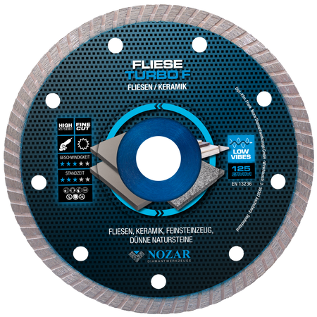 Die Nozar Dia-TS 125x22,23 mm Fliese Turbo F ist eine leistungsstarke Diamant-Trennscheibe, die speziell für das schnelle und saubere Schneiden von Fliesen und keramischen Materialien entwickelt wurde. Mit einem Durchmesser von 125 mm und einer Bohrung von 22,23 mm bietet sie optimale Kompatibilität für den professionellen Einsatz.