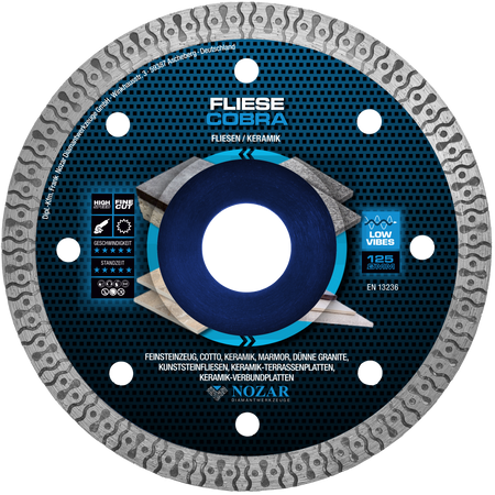 Die Nozar Dia-TS 125x22,23 mm Fliese Cobra ist eine leistungsstarke Diamant-Trennscheibe, speziell für das saubere und präzise Schneiden von Fliesen und keramischen Materialien. Mit einem Durchmesser von 125 mm und einer Bohrung von 22,23 mm bietet sie optimale Kompatibilität für den professionellen Einsatz.