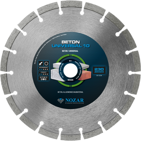 Die Nozar Dia-TS 230x22,23 mm Beton Universal 10 ist eine hochwertige Diamant-Trennscheibe, speziell für das Schneiden von Beton und anderen harten Baustoffen. Mit einem Durchmesser von 230 mm und einer Bohrung von 22,23 mm bietet sie eine präzise und effiziente Schnittleistung.